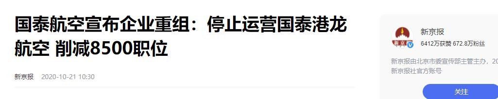 年底,国泰航空又宣布重组企业,包括裁员、减薪,甚至为了降低运营成本,国泰航空被迫关闭了旗下的港龙航空。