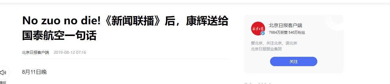 这还没完,康辉还委婉的点国泰航空有些人听不懂中文,这四个字用英文说就是No zuo no die!