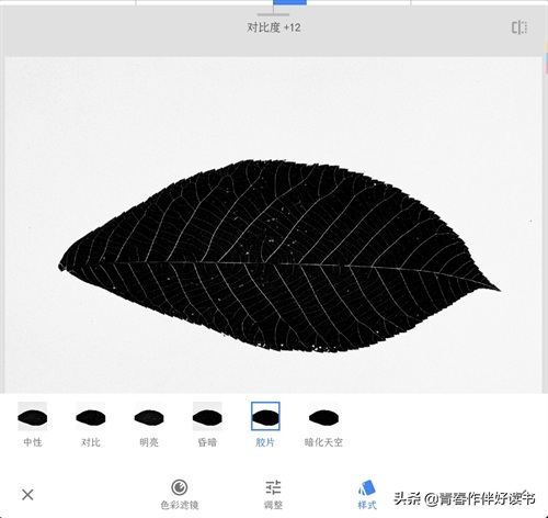 ①将绿色的树叶素材导入到snapseed中,并使用黑白功能,将其处理为黑白照。