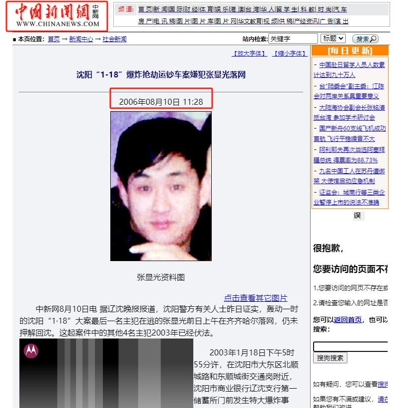 中国新闻网《沈阳“1·18”爆炸抢劫运钞车案嫌犯张显光落网》