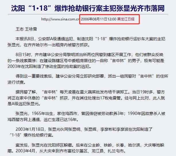 信息来源:黑龙江日报《沈阳“1·18”爆炸抢劫银行案主犯张显光齐市落网》