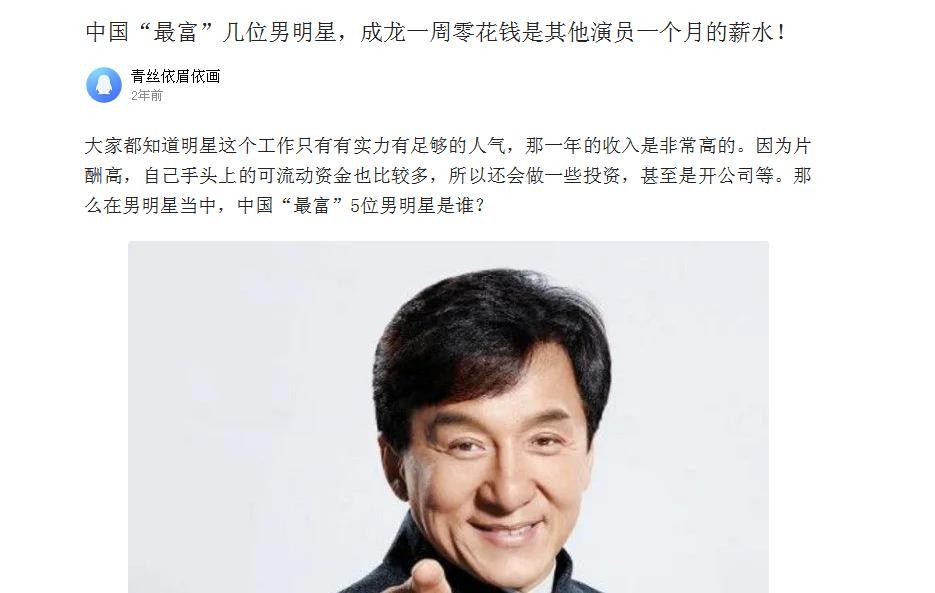 出道四十多年来,成龙除了事业有成,财富的收获也是交出漂亮答卷。