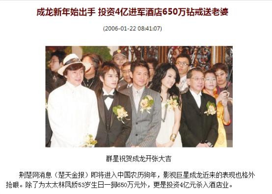成龙也很喜欢投资酒店。2006年,成龙就已经投资4亿进军酒店业。