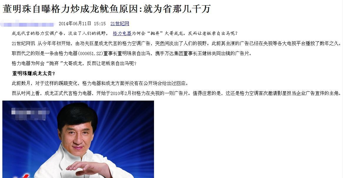 董明珠受访时也说,成龙代言空调的广告费几千万。