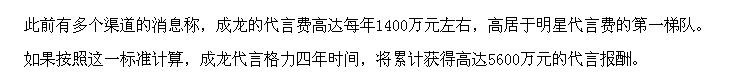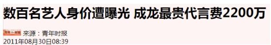 2011年,就有媒体透露成龙代言费高达2200万。