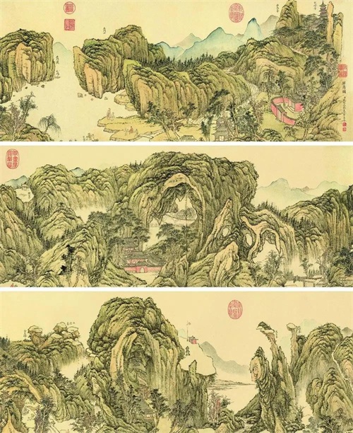 【二十五】雁荡图。钱维城作品。2010年,保利以1.2992亿元拍出。此作品是乾隆皇帝钦点著名画家钱维城的代表作。此卷长7.312米,乾隆的八玺齐全,并有宣统、嘉庆皇帝鉴藏印。