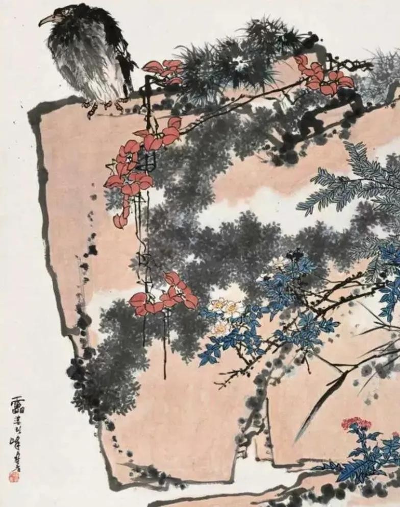 【六】鹰石山花图。潘天寿作品。2015年,嘉德拍卖行以2.7945亿元成交。画作创作于上世纪六十年代,采用了山水和花鸟相结合创作图式,由鹰石、野草、山花等构成。