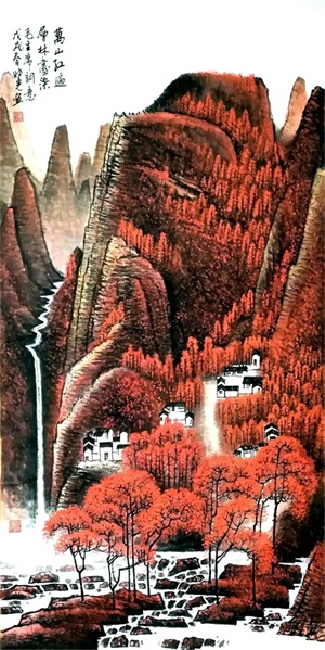 【五】万山红遍。李可染作品。2012年,北京保利以2.9325亿元人民币拍出。作品取毛泽东“看万山红遍,层林尽染”的诗意。在1962至1964年,李可染大胆试用朱砂作画,据了解,“万山红遍”主题作品共有七幅。
