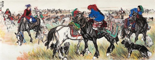 【二十六】欢腾的草原。黄胄作品。2013年,保利以1.288亿元拍出。此画创作于1981年,描绘新疆人民进行“马上较力”活动的场面。