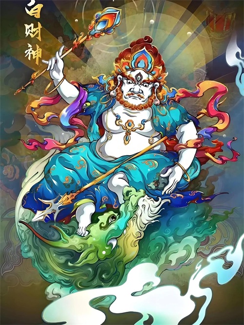 白财神的样子很有特点,他皮肤是白色的。为啥是白色呢?因为在一些说法里,白代表着金,还和西方有关系。这白色就像是他独一无二的标志,一看到白色,就知道是白财神来啦!而且他还有个超酷的坐骑——龙,所以他也被叫做骑龙布禄金刚。想象一下,白财神骑着威风凛凛的龙,在天空中穿梭,那场面得多震撼!就像电影里的超级英雄骑着超炫的坐骑登场,白财神骑着龙的样子,肯定也超帅。
