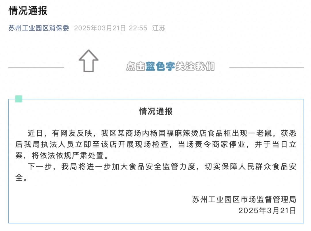 3月21日晚,苏州工业园区市场监督管理局就近日辖区某商场内杨国福麻辣烫店食品柜出现老鼠一事发布情况通报。