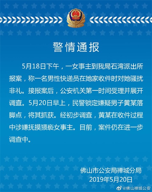 20日,佛山禅城警方通报此事称,5月18日下午,一女事主到该局石湾派出所报案,称一名男性快递员在她家收件时对她骚扰非礼。接报案后,公安机关第一时间受理并展开调查。5月20日早上,民警锁定嫌疑男子黄某落脚点,将其抓获。经初步调查,黄某在收件过程中涉嫌抚摸猥亵女事主。目前,案件仍在进一步调查中。