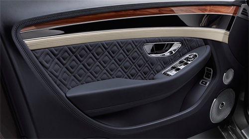 在内饰的皮革运用上,菱形的元素充满了整个车厢。从车门两侧的扶手处到前后排的座椅上,我们都可以看到一个个独立的菱形图案。