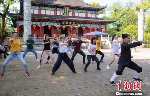 资料图:当地时间2019年4月17日,留学生在江西鹰潭龙虎山天师府前,跟着道长学太极拳,感悟道家文化。 吴志成 摄
