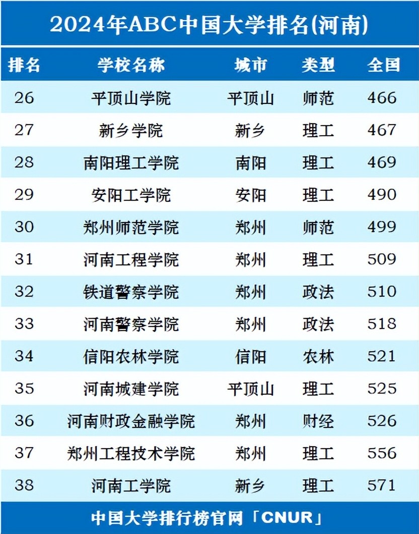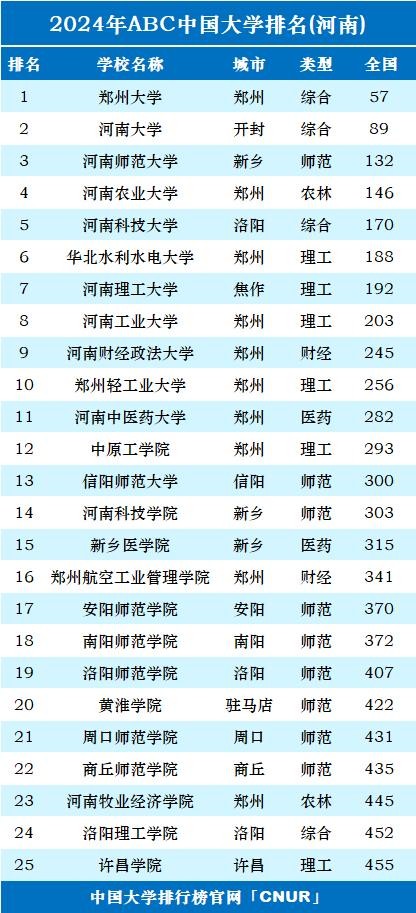 2024年ABC中国大学排名已正式发布,共有835所公办普通本科院校上榜,其中河南省38所。