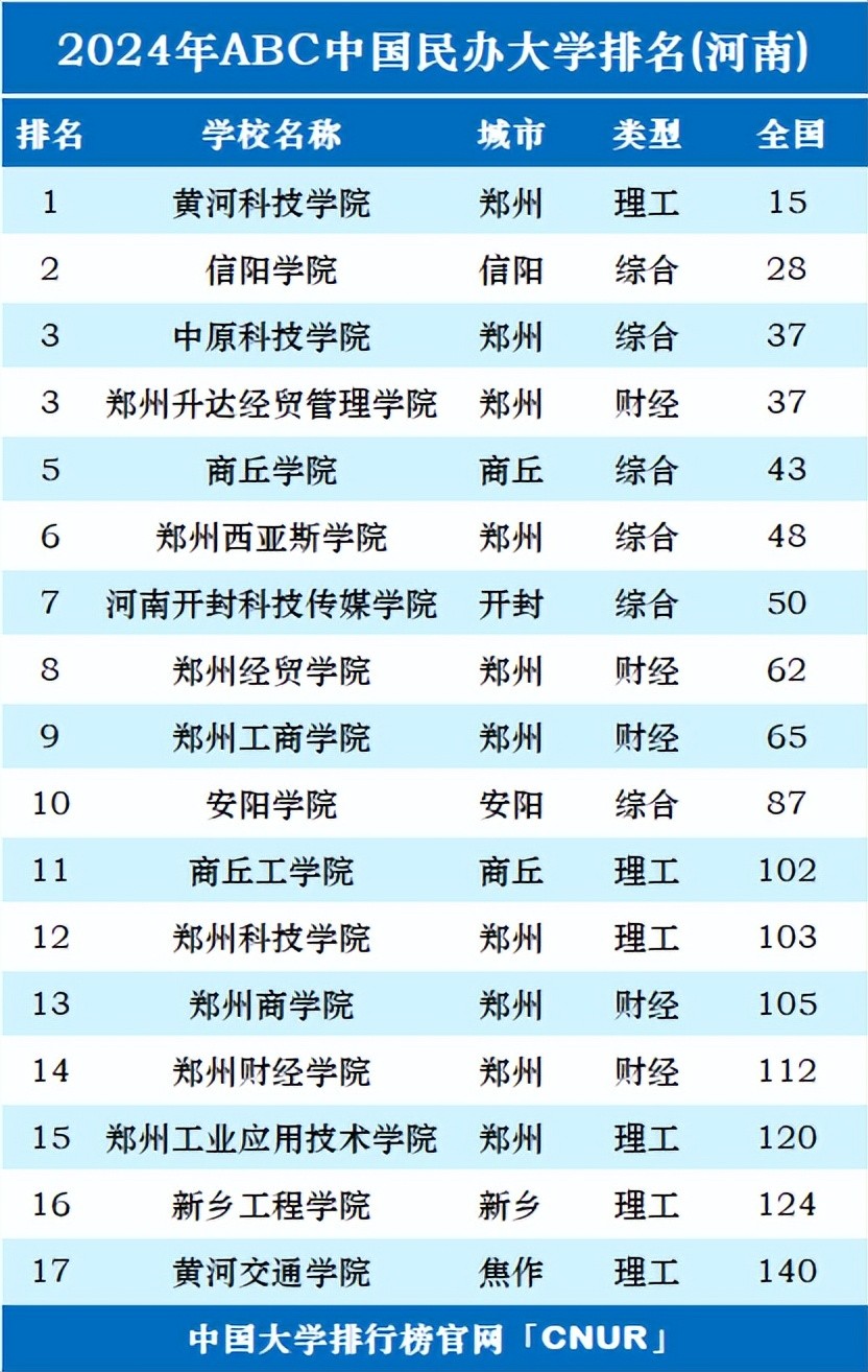 另外,河南省共有17所民办大学上榜2024年ABC中国民办大学排名,分别为黄河科技学院(全国第15)、信阳学院(全国第28)、中原科技学院(全国第37)、郑州升达经贸管理学院(全国第37)、商丘学院(全国第43)等。