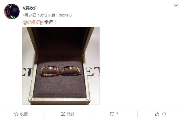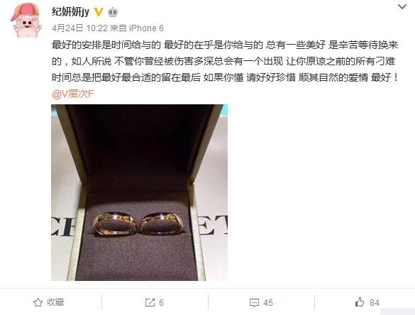 4月25日,素有“女科比”之称的WCBA球员纪妍妍微博上晒出一张对戒的照片疑似公开恋情,配上了文字的诠释,从这段文字可以看出纪妍妍应该是恋爱了,还特意艾特了疑似恋人的@V层次F。