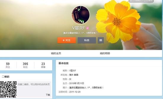 “@V层次F”在微博上标注的身份如下:所在地是在泰国,性别是女性,简介上写着潘多拉魔厨创始人!P.S酒吧老板!