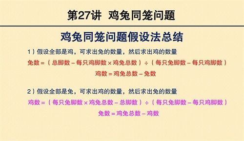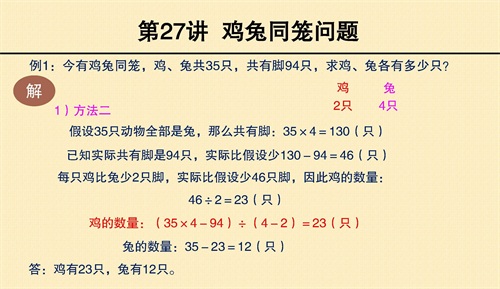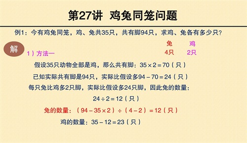 解答鸡兔同笼问题的方法很多,但应用最广泛,最重要的是假设法。假设法的步骤有以下几步: