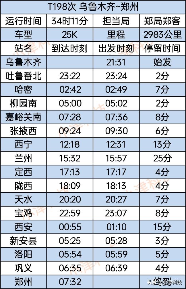 乌鲁木齐站至郑州站T198次运行34小时11分,经停乌鲁木齐、吐鲁番北、哈密、柳园南、嘉峪关南、张掖西、西宁、兰州、定西、陇西、天水、宝鸡、西安、新安县、洛阳、巩义、郑州。