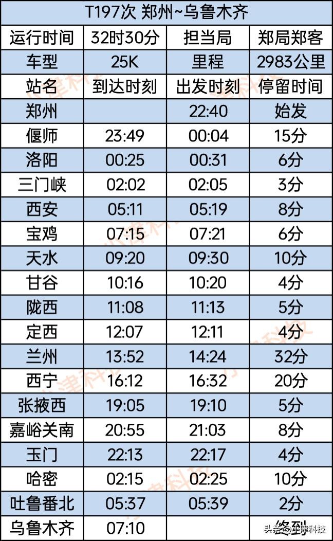 郑州站至乌鲁木齐站T197次运行32小时20分,经停郑州、偃师、洛阳、三门峡、西安、宝鸡、天水、甘谷、陇西、定西、兰州、西宁、张掖西、嘉峪关南、玉门、哈密、吐鲁番北、乌鲁木齐。