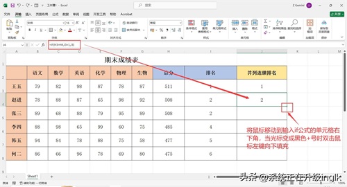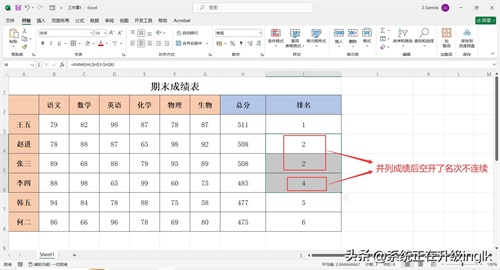 若需要排名的成绩有相同的数据(即存在并列成绩),按上述方法排名后会发现,并列成绩后空开了名次不连续(如图所示7),那么可继续下列操作: