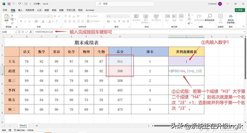 注:公式“=IF(H3>H4,J3+1,J3)”指,若第一个成绩“H3”大于第二个成绩“H4”,则名次就是第一个名次“J3”+1;否则就并列等于第一个名次“J3”。