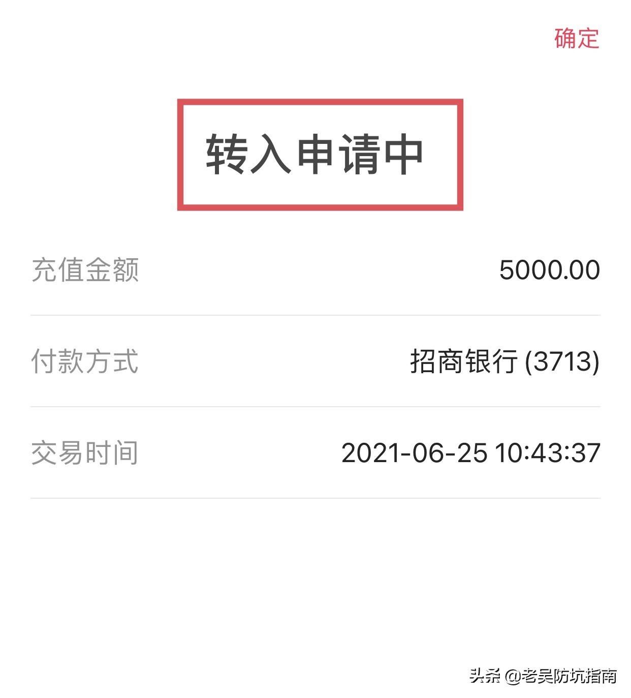如果你看到这个界面,显示“转入申请中”,那代表转入失败,是充值超出了当日限额,只能等第二天继续转。具体每个银行的限额是多少,请看上面的图。