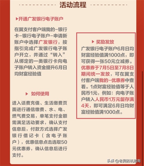 翼支付昨天发了一个新活动,只需要开通一个广发银行的电子账户,并充值成功,钱放在账户里5天,即可获得50元大红包。