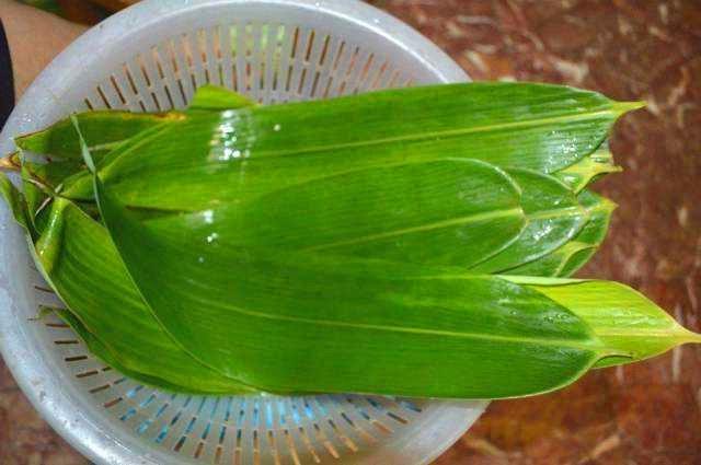 第一步、首先将采摘回来的粽叶用清水清洗掉表面的杂质以及灰尘,然后剪掉两端,注意不要剪得太多,不然粽叶就会太短了,将处理好的粽叶放到盆中,加入适量的清水,将其浸泡一晚上的时间,让粽叶吸收足够的水分。