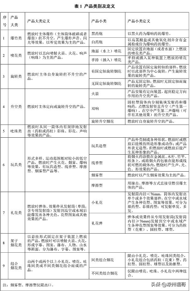 根据《烟花爆竹安全与质量》(GB10631)规定,按照结构与组成,烟花爆竹产品分为爆竹类、喷花类、旋转类、升空类、吐珠类、玩具类、礼花类、架子烟花类等九大类(见表1:产品类别及定义));按照药量及所能构成的危险性大小,烟花爆竹产品分为A、B、C、D四级;按照对燃放人员要求的不同,烟花爆竹产品分为个人燃放类、专业燃放类。烟花爆竹经营零售店(点)按照规定只能销售符合标准的C、D级个人燃放类烟花爆竹产品(见表2:个人燃放类产品最大允许药量)。
