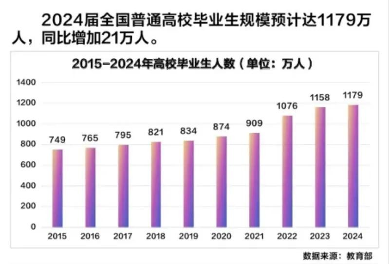 一是供给过剩,2024年高校毕业生1179万,加上中专技校、海归以及前几年未就业的存量,实际竞争人数超过2000万,而市场能提供的“体面岗位”不到1/3。这意味着,每年有超过半数的大学生毕业即失业。