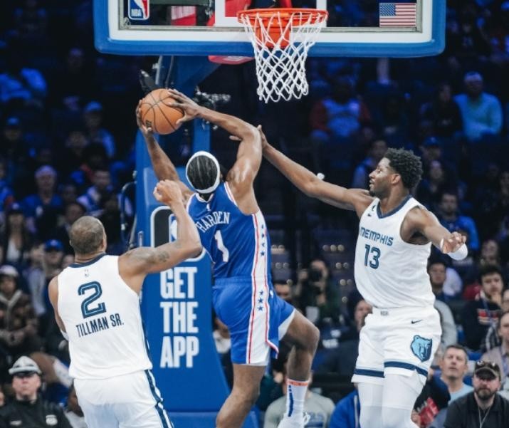 哈登31+7+7里程碑恩比德27+19+6+6帽76人逆转擒灰熊!