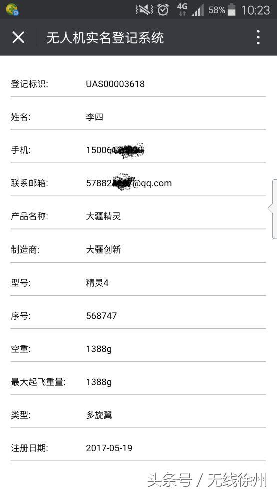 而这个二维码相当于无人机的"身份证"和"准飞证",至关重要。 拿出手机,扫一扫这个二维码,这架无人机的各种信息就都能显示出来了。