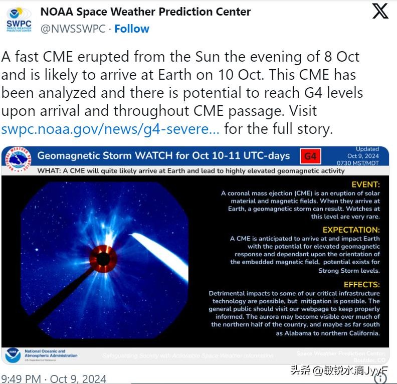 这次地磁风暴的起因是一股来自太阳的强大太阳耀斑和日冕物质抛射(CME),它们将以每小时超过400万公里的速度直冲地球。根据专家的预计,这场风暴可能会在周四凌晨到中午之间(美国东部时间)抵达地球,并持续至周五。风暴不仅带来美丽的极光,还可能干扰通信、电网和卫星运行,相关部门已经做好了应对准备。
