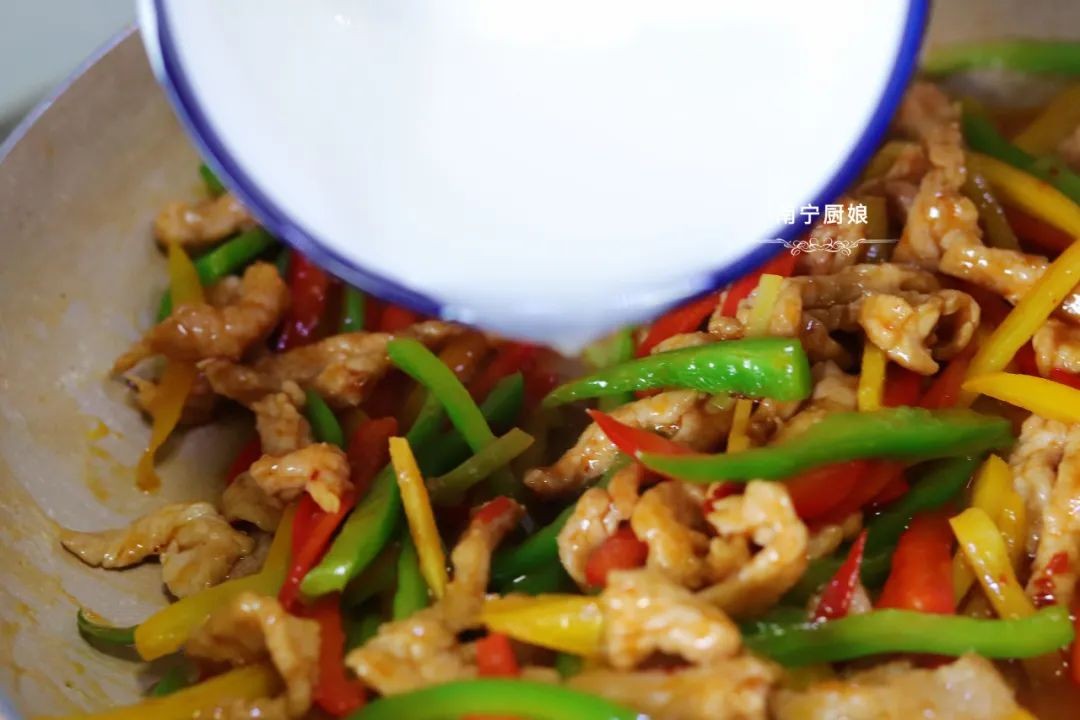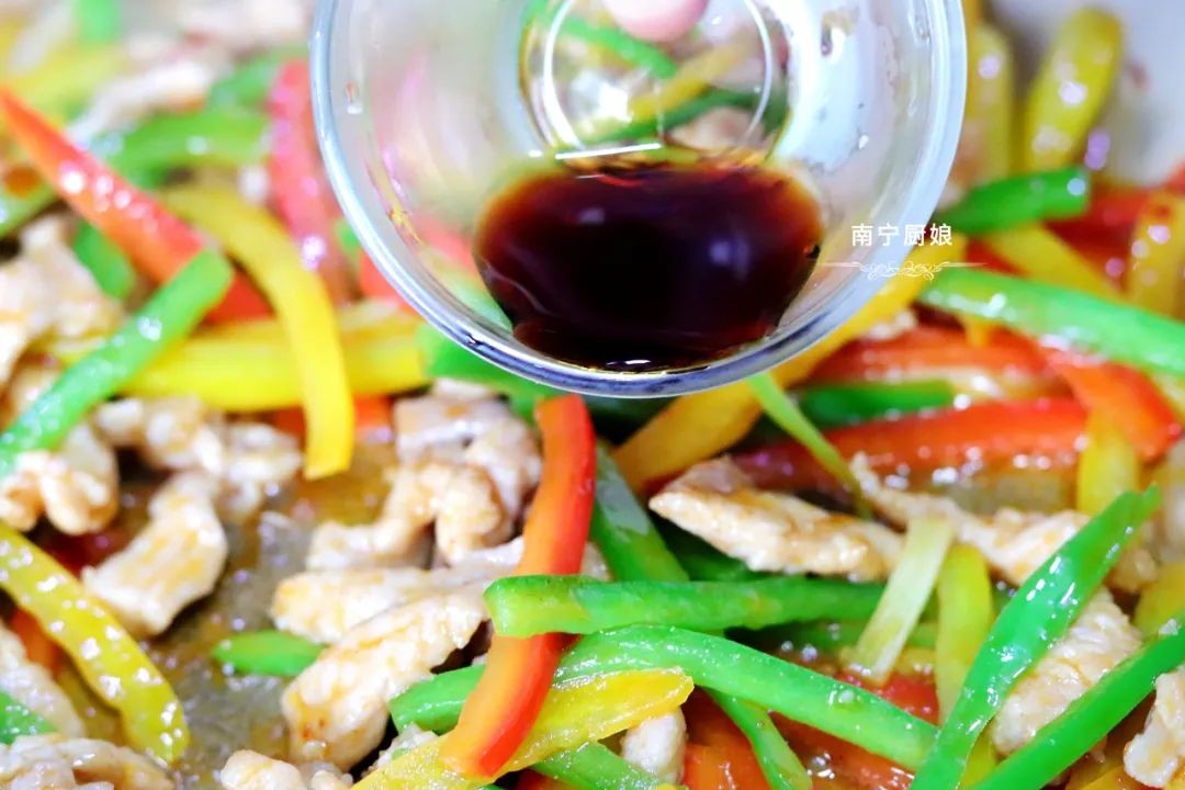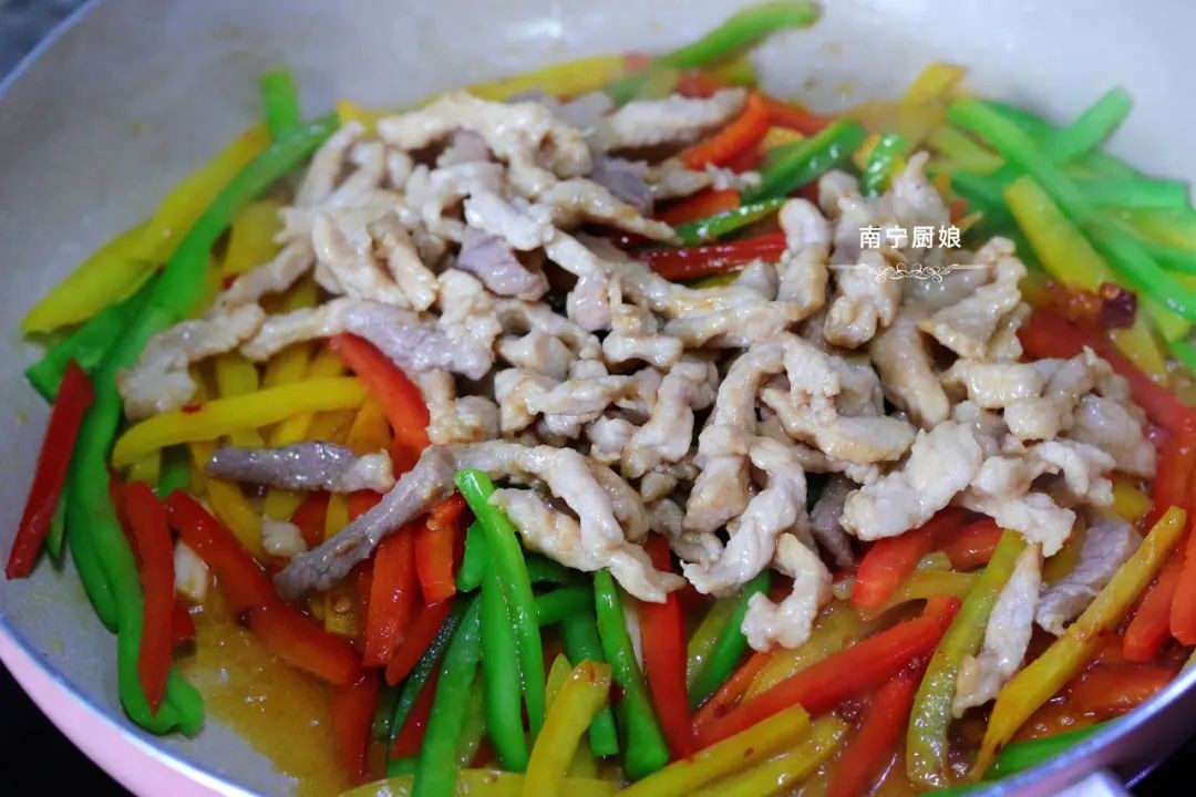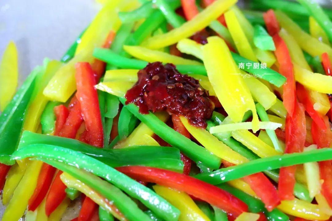 第五步:接着往锅里倒入青椒丝、红甜椒丝和黄甜椒丝,加入1勺豆瓣酱,小火转中火翻炒3分钟。