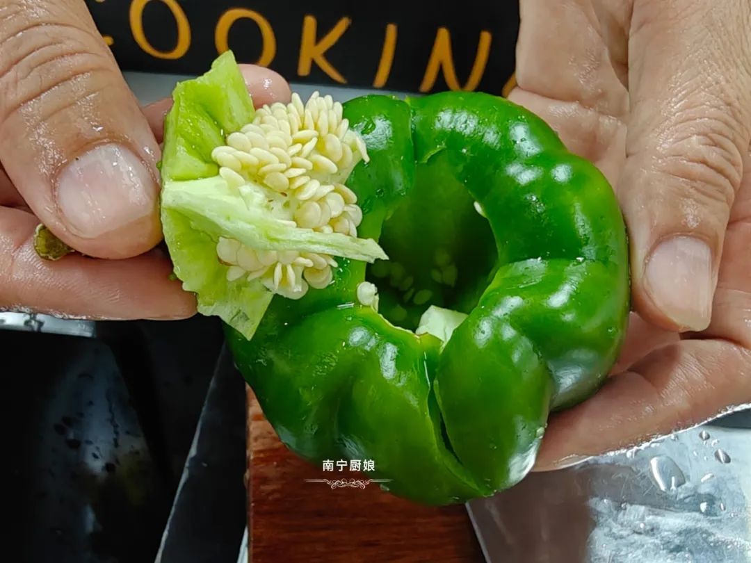 第二步:然后把其他的配菜都处理好,先用水把配菜洗干净,接着握住青椒和红甜椒、黄甜椒的根蒂处,向内按压然后往外用力一拔,就能把根蒂和辣椒籽一起取出,最后把彩椒都切成细丝备用。