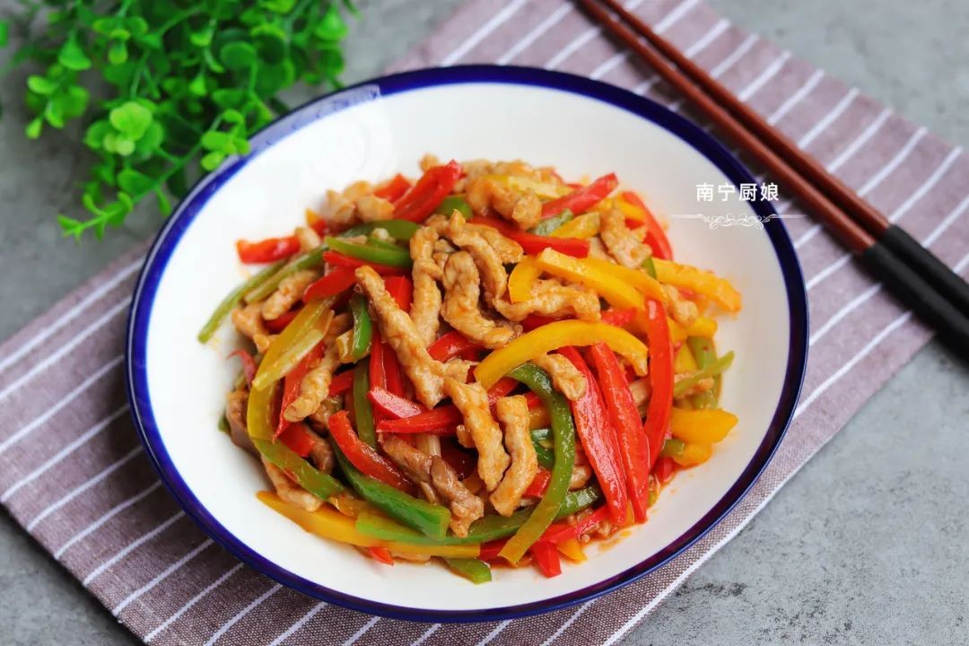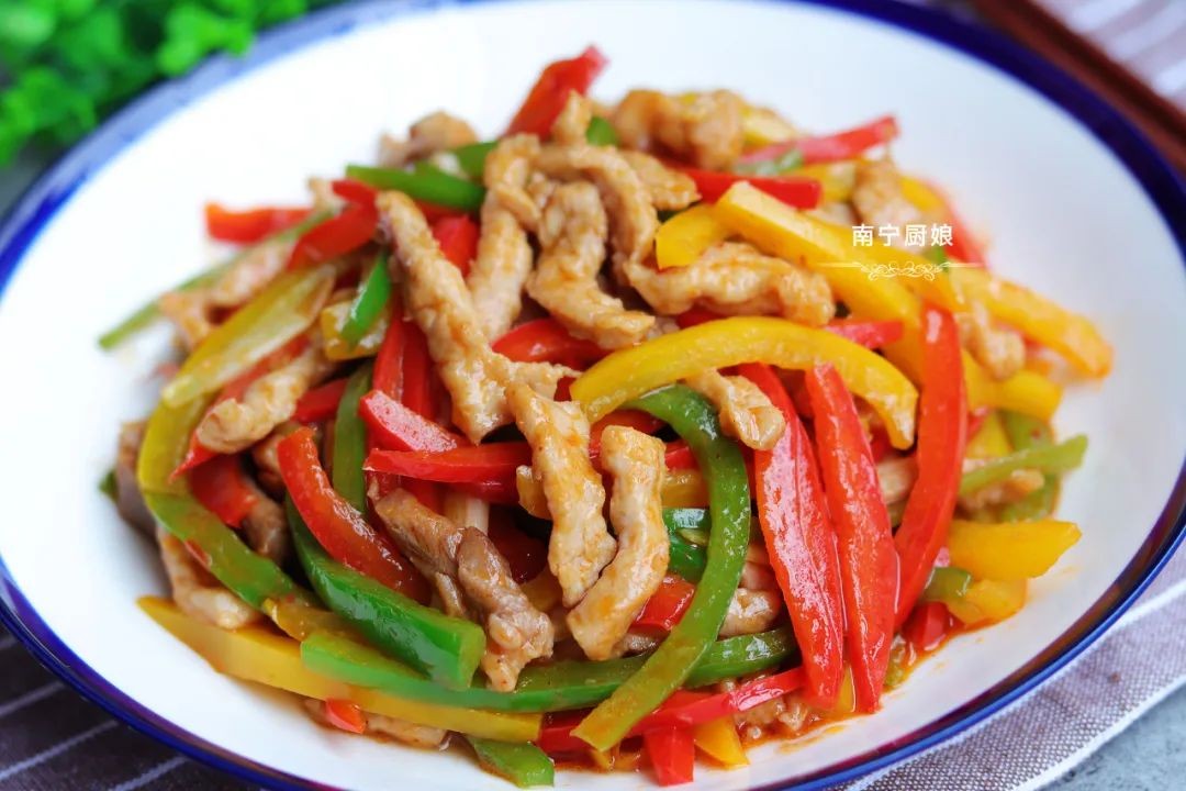 准备食材:猪里脊肉300克、青椒1颗、红甜椒1颗、黄甜椒1颗、生姜1块、小葱2根、盐2勺、生抽1勺、蚝油半勺、鸡精1勺、豆瓣酱1勺、1勺玉米淀粉。