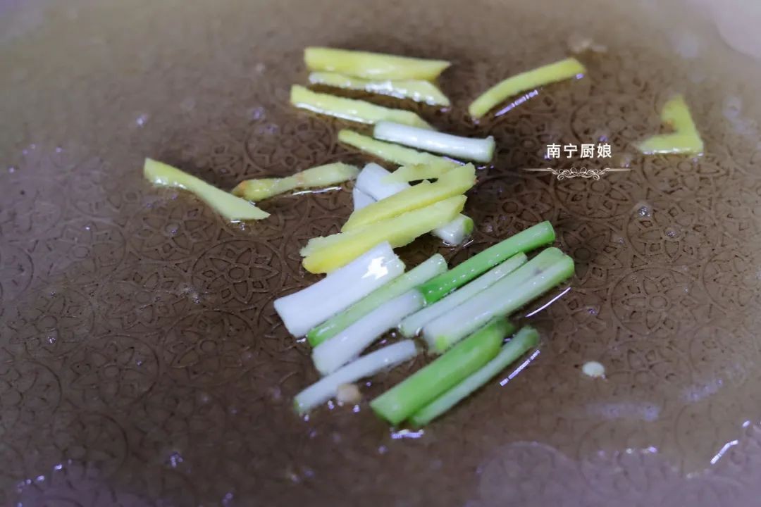 第四步:生姜切丝,小葱只要葱白,放在菜板上待用。锅中倒入适量的油,小火加热10秒钟,然后放入姜丝和葱段炒出蒜香和葱香。