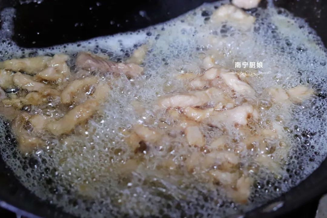 第三步:往锅里倒入三分之二的食用油,中小火加热1分钟,将筷子立在油锅中,筷子上有气泡附着的时候下入肉丝,炸3—5分钟左右,肉丝颜色呈微微发黄后,用漏勺捞出。