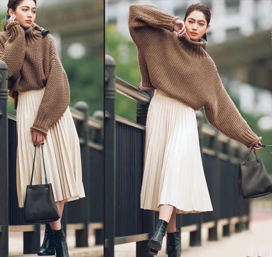 像是毛衣+半身裙,就是一身让女性很信任的搭配,可以将女性自身的温柔魅力,轻松地释放出来。而且这对服装搭档也不会挑剔身材,宽松的轮廓可以掩藏一些瑕疵,使身材看上去更优美。