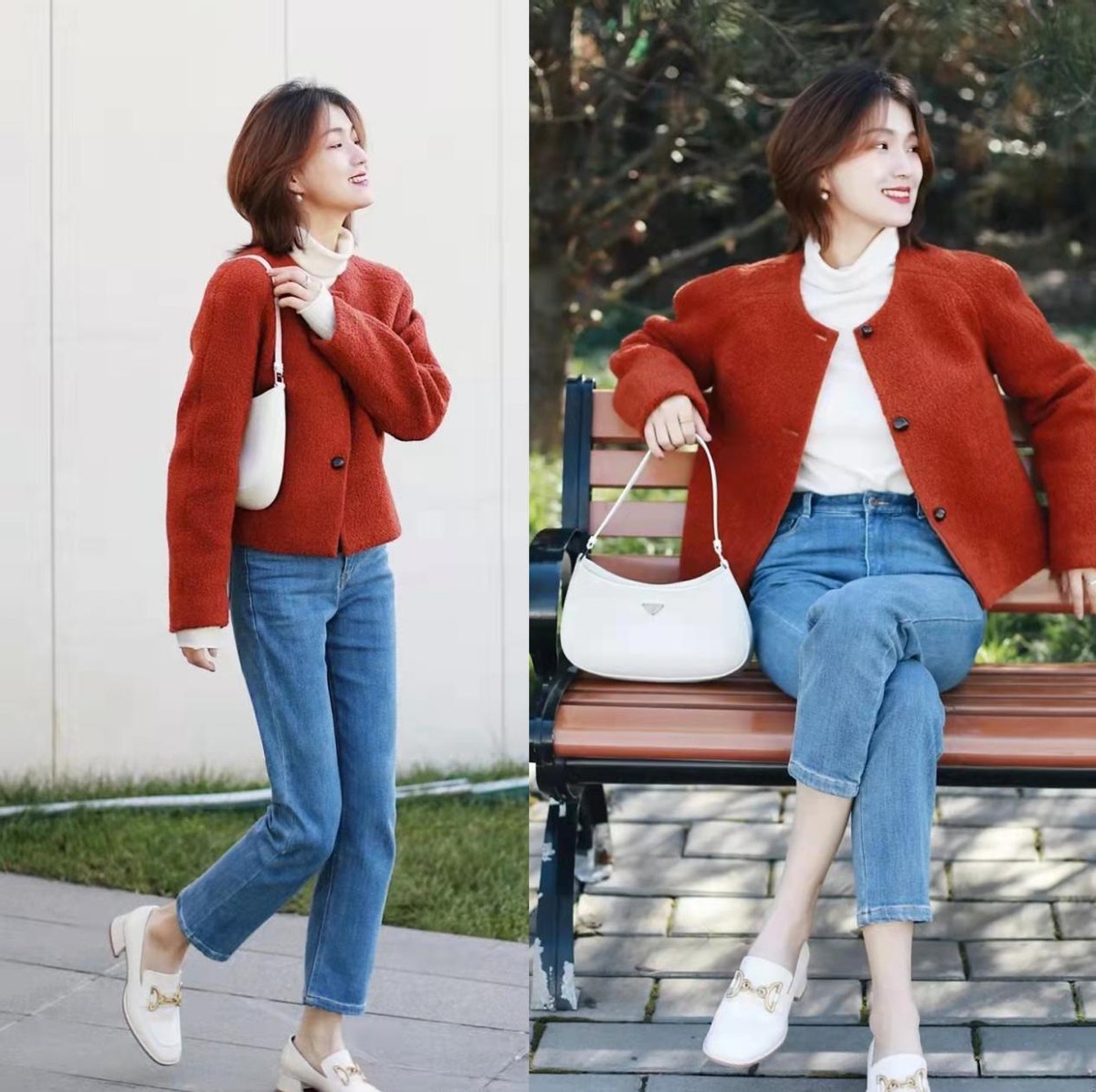 担心红色太难以驾驭的话,可以像图中一样,直接采取蓝色的牛仔裤,照样有着很清爽的画面感,还很耐穿舒适。