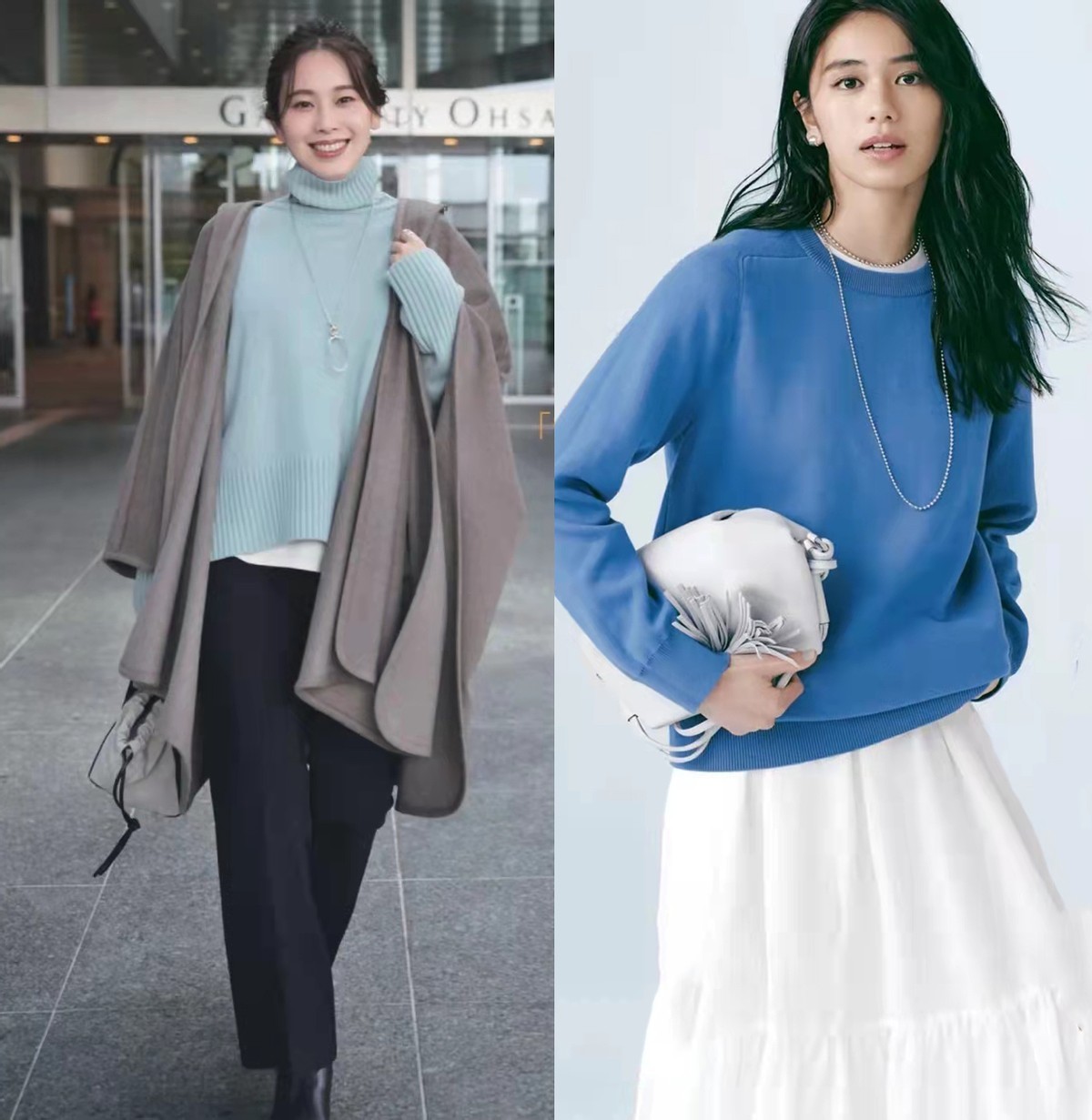 蓝色是一种很衬气色的色调,可以在冬季多穿一些蓝色的上装,显得脸色更加白皙有光泽。像图中这两种不同饱和度的高领毛衣,可以看出左图会显得人更柔和文静,但是却不如右图的这件毛衣更显白,因此一定要多关注饱和度的高低。
