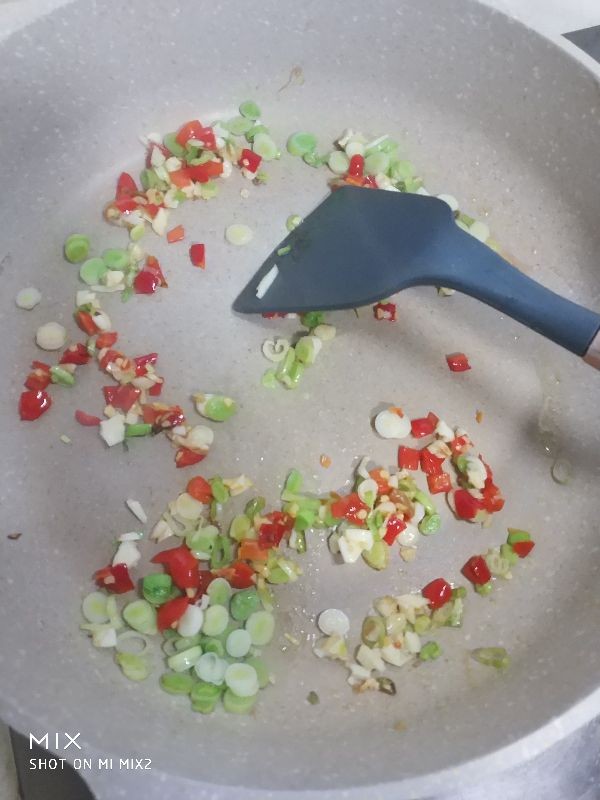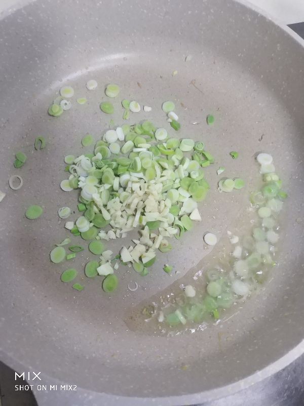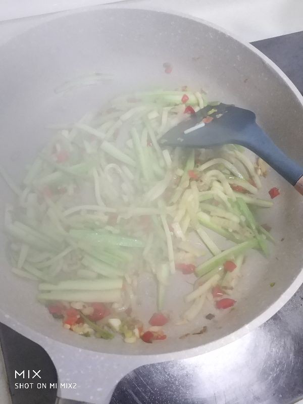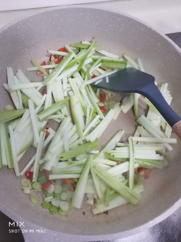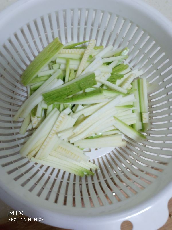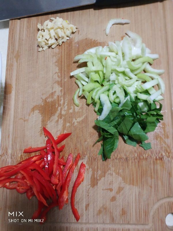 3,上海青洗净后切丝,红椒洗净切丝,西葫芦洗净也切成丝,蒜切沫,蒜苗白切圈
