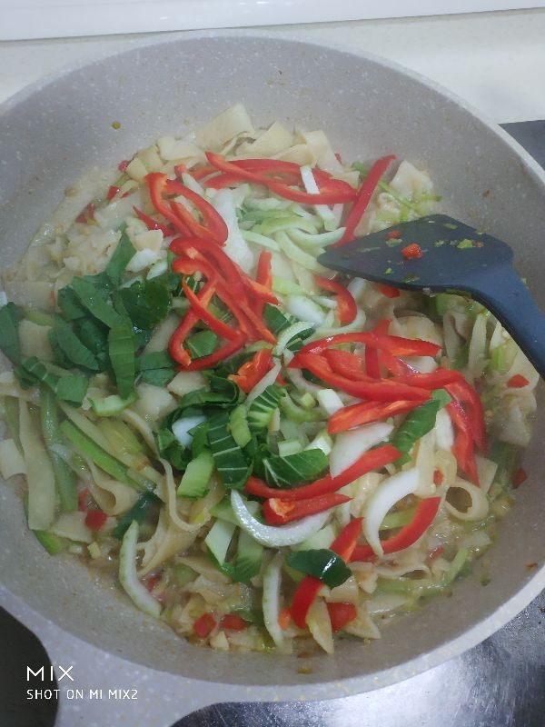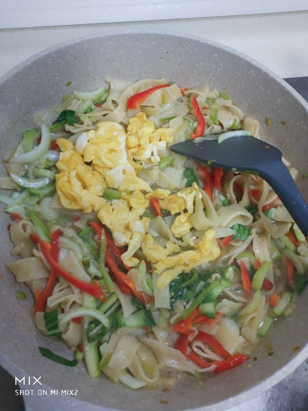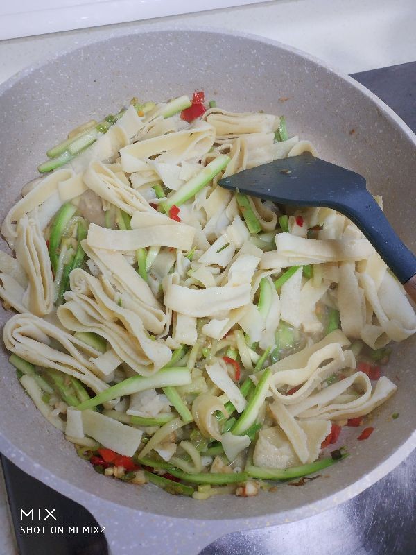 5,在起锅倒油,放蒜沫和蒜苗白进去炒香,倒入西葫芦翻炒,加盐,胡椒粉,花椒粉调味,待到炒软后把泡软的豆饼丝放进去炒,边炒边加适量的清水,全部炒入味后加入青菜,红椒丝,鸡蛋碎一起大火翻炒,起锅前加点生抽入味,炒好后关火出锅装盘即成