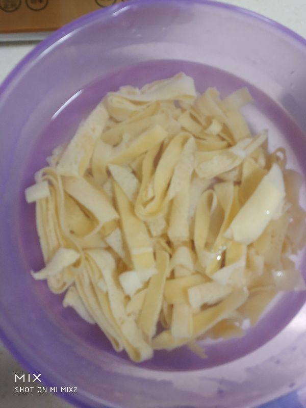 这个豆饼丝是属于湖北宜昌远安地区的一道特色美食,从小我就很爱吃这种,不管是煮着吃,下火锅吃,还是泡软后做的烧烤,都是很不错的一道美食,那今天我介绍的做法是素炒豆饼丝,来看看吧: