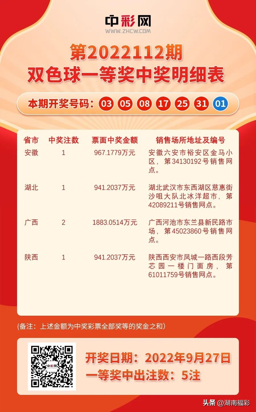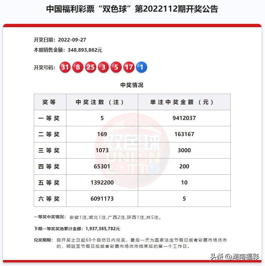 当期双色球头奖5注,单注奖金为941万多元。这5注一等奖花落4地:安徽1注,湖北1注,广西2注,陕西1注。