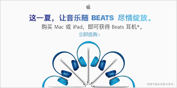 苹果中国官网2016年“这一夏,让音乐随Beats尽情绽放”返校季大促已拉开大幕,高校师生购买符合条件的Mac、iPad或iPhone,即可获赠Beats无线耳机一副。购买Mac或iPad时,还能享受叠加的Apple教育优惠福利。