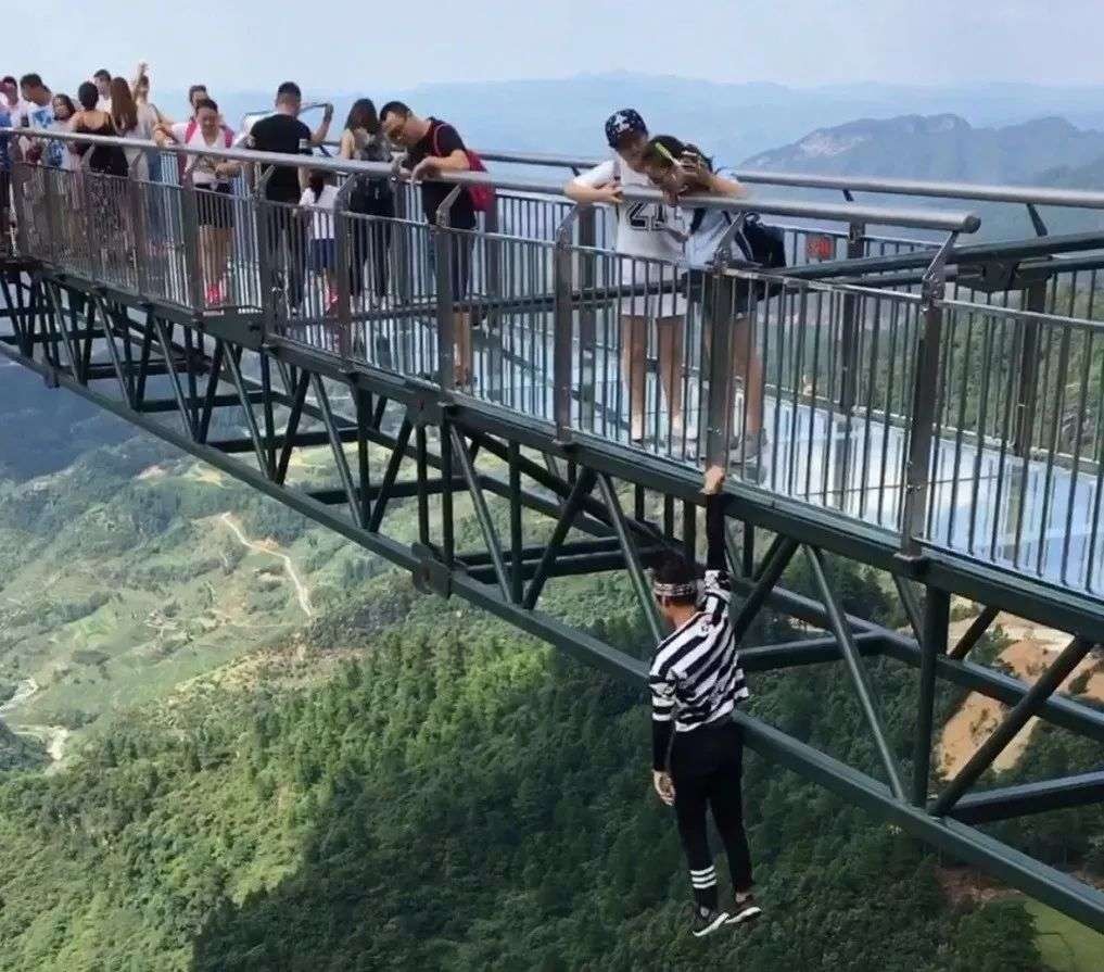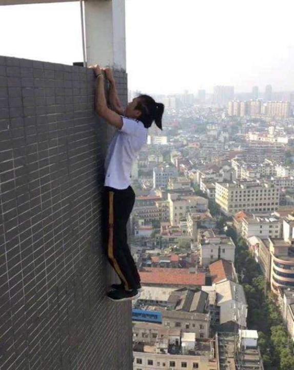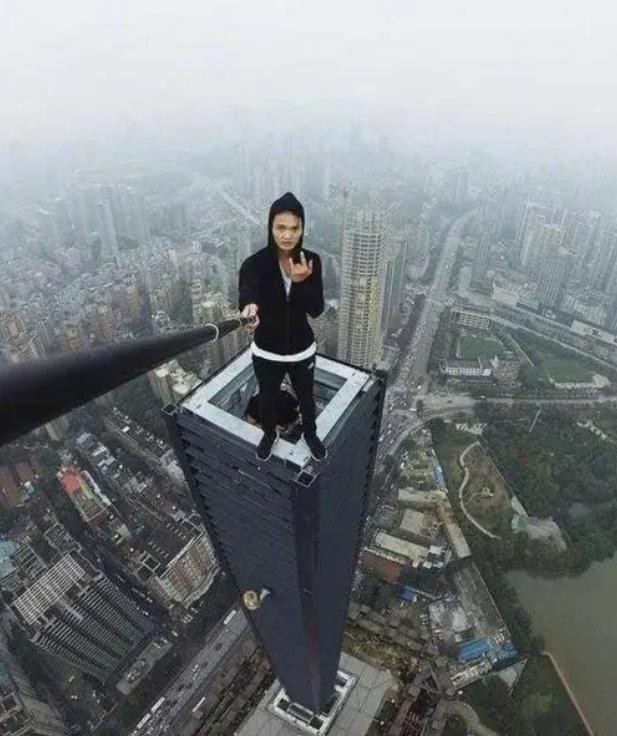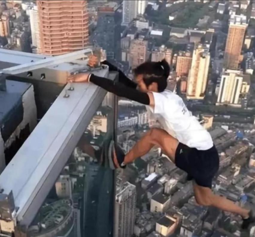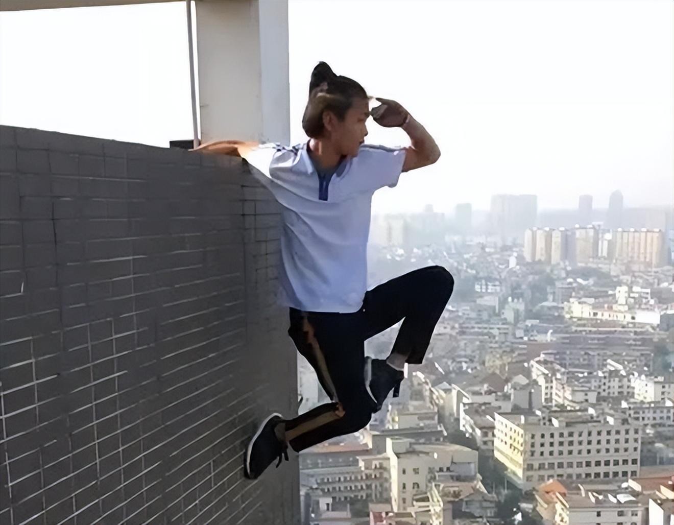 其中最令人印象深刻的是他在长沙国金楼顶演绎的"猴子观海":单手抓住楼顶的护栏,整个身体悬空于一臂之上,另一只手还在眼前搭起遮阳棚。