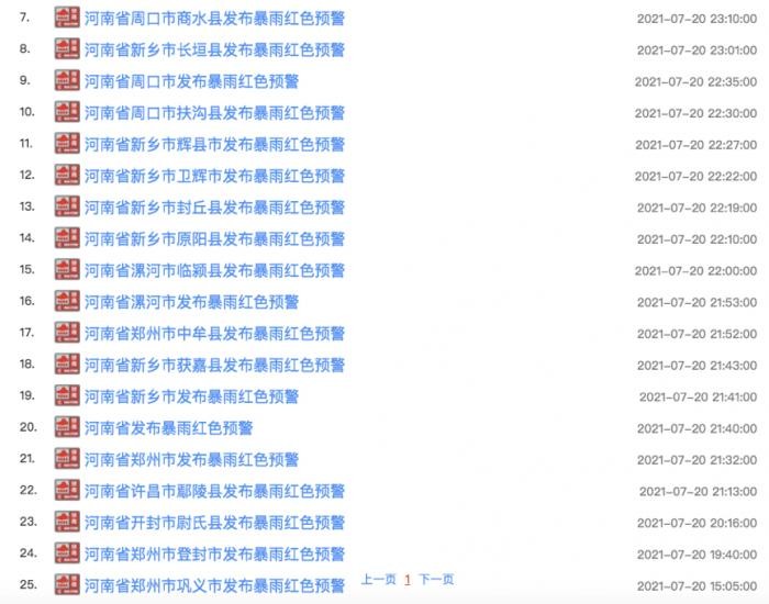 21世纪经济报道记者查询河南省气象台预警信息发现,河南早在7月19日04时15分发布暴雨橙色预警,并在20日15:05发布郑州市巩义市暴雨红色预警,于21:40发布全省暴雨红色预警。